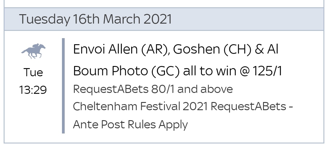 February 5, 2021 at 19:04 #1521460I’ve covered Honeysuckle 13-2 ew NRNB for this having already been on for the Mares Hurdle, in case she did beat Sharjah tomorrow and connections decide to reroute.