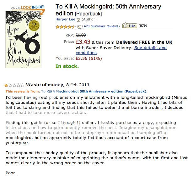 You’ll find plenty of one-star reviews on Amazon, for Dickens, Steinbeck, et al and a quite funny one amidst the shower of 5-stars on To Kill a Mockingbird: