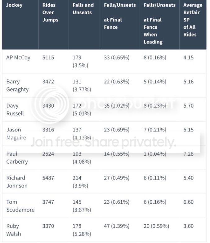 January 30, 2017 at 15:07 #1284782Are ther any stats on Roby’s last fence falls, compared to other jockeys, bearing in mind that these stats can be skewed in many ways.