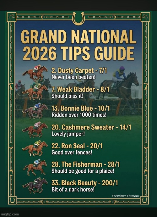 Things turn out best for those who make the best of how things turn out...April 11, 2026 at 19:14 #1763239When I saw blind Dave on Monday he asked if I’ll be having a bet in the National. I told him I will bet the horse who has never been beaten “Dusty Carpet” forgot all about it