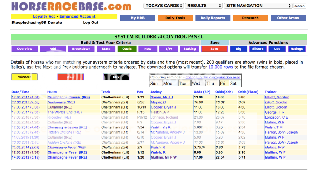 January 5, 2018 at 21:44 #1335773Thanks Joe – and thanks for posting that; I wasn’t aware of Horseracebase and have had a look (without taking the free trial). I’d want rather more info on pedigree than it seems is available from the screen shot, so I think for the moment I will stick with Excel. But, if it will allow that quick a calculation of the win/place SR by sire then I’d say it is probably worth writing up a breeding tutorial for the site. As your figures show, anyone who’d followed Stowaway’s progeny at Leopardstown over hurdles would have made a tidy profit. He’s not done too badly at Cheltenham either … on which, and thinking ahead, On the Blind Side (of whom I’m a massive fan) is another of his, as is the yet-to-reappear Pym (in the same ownership as Altior).