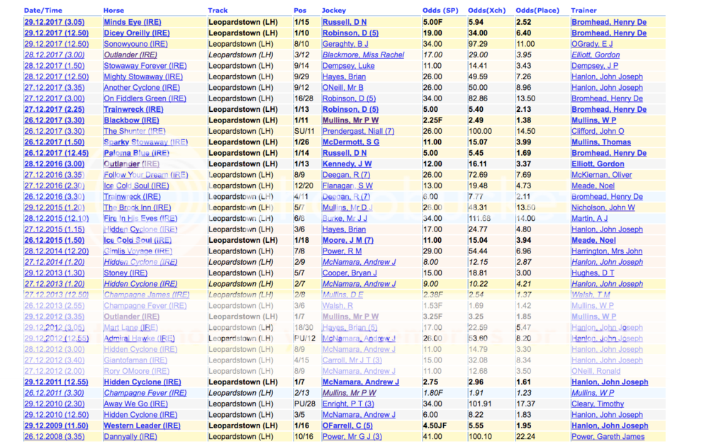 Stowaway’s overall Leopardstown Christmas Festival win SR is 28.21%. His place SR is 41.03%.