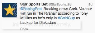Ruby said at a preview 10 to 14 days ago that he’d be doing whatever was needed to convince Ricci to switch Vautour to the Ryanair. A few days later Tony Mullins says publicly that Vautour would run in the Ryanair unless Djakadam wasn’t ready. Neither mentioned anything about the horse working poorly. This has been a plot, and I suspect it has been driven more by Ruby than by Mullins who should – I hope – regret being drawn into it all.